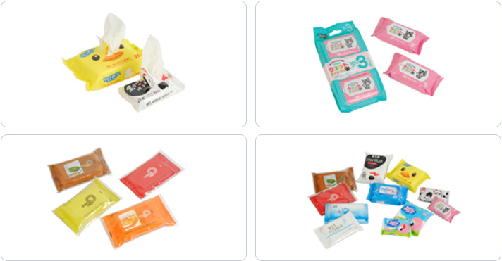 工作流程:原紙氣脹中心開卷→自動(dòng)張力→原紙自動(dòng)糾編系統(tǒng)→折疊→定量加液→定長度切斷→橫向?qū)φ邸讯鈹?shù)片→單雙疊并線輸送→包裝膜開口貼標(biāo)→制袋→入袋包裝→封口→成品輸出。